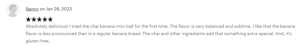 Customers can’t get enough of our Chai Banana Bread Mini Loaf. “Absolutely delicious!” says Nancy from our Etsy store, while Sher adds in a Google review, “I could not stop eating it!! Delicious!”